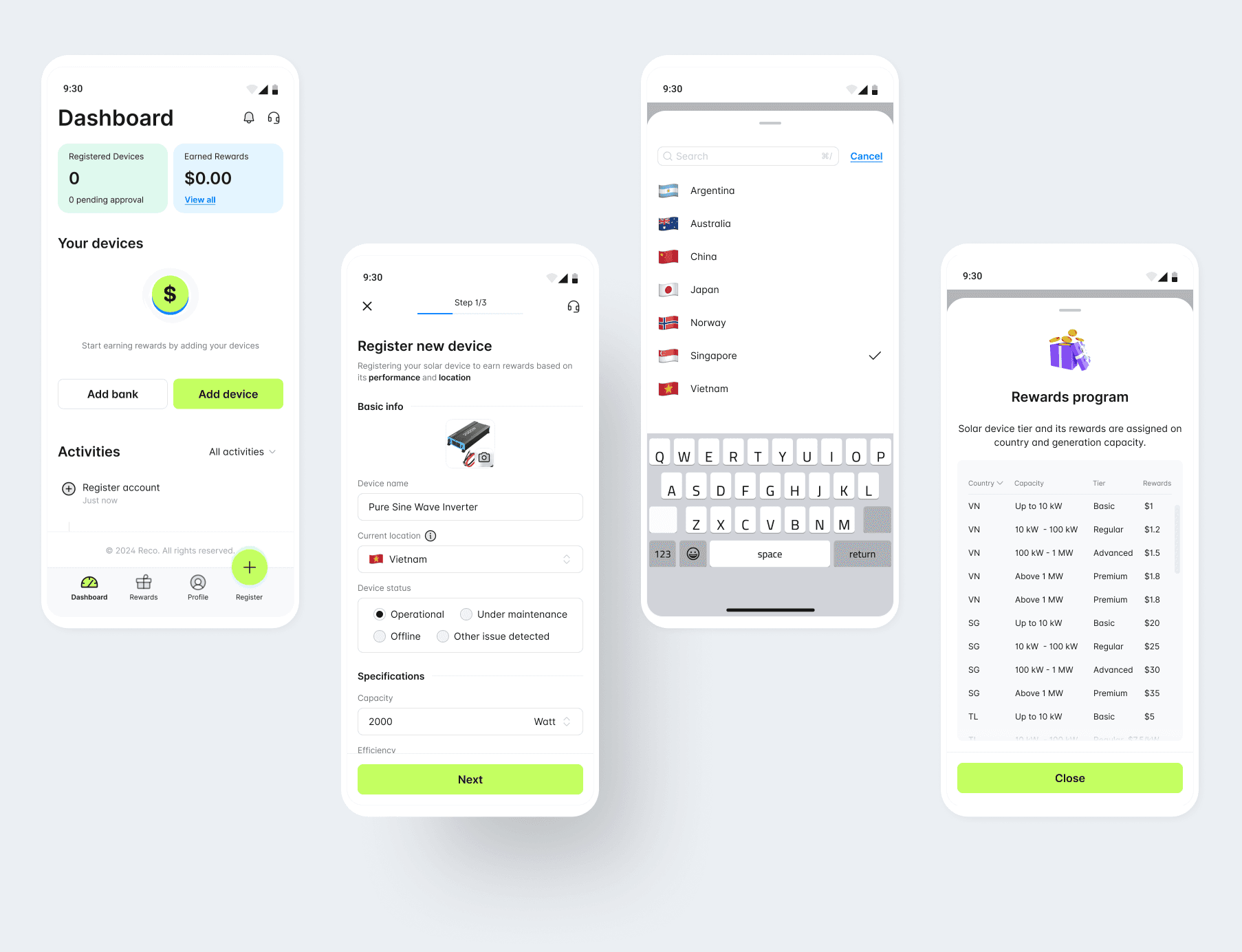 Reco is a new mobile app that makes it easy to register your solar devices and earn rewards for the clean energy you generate. The app streamlines the process of adding your device details and then tracks your energy output, so you can see your financial benefits grow.