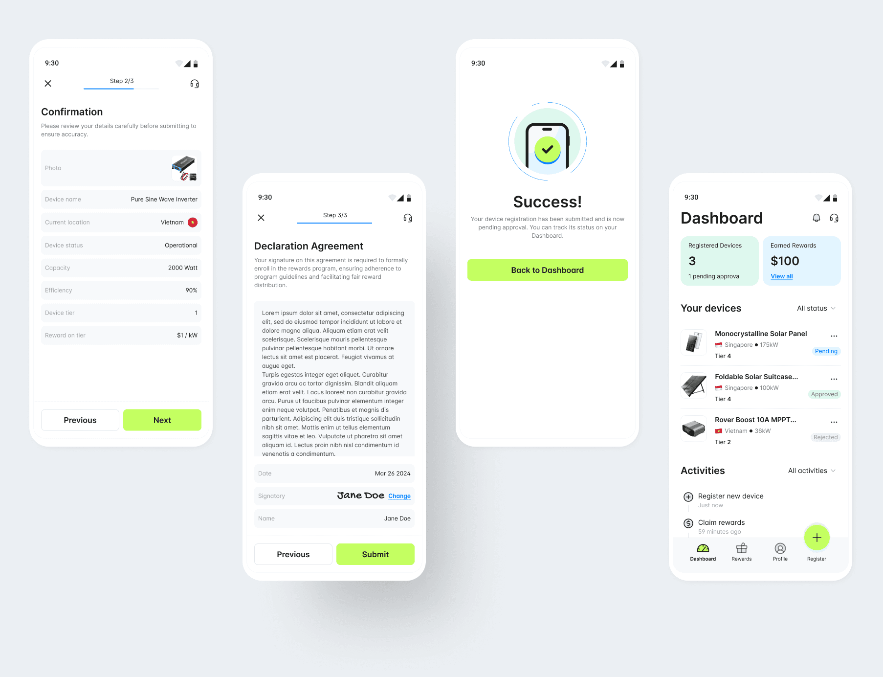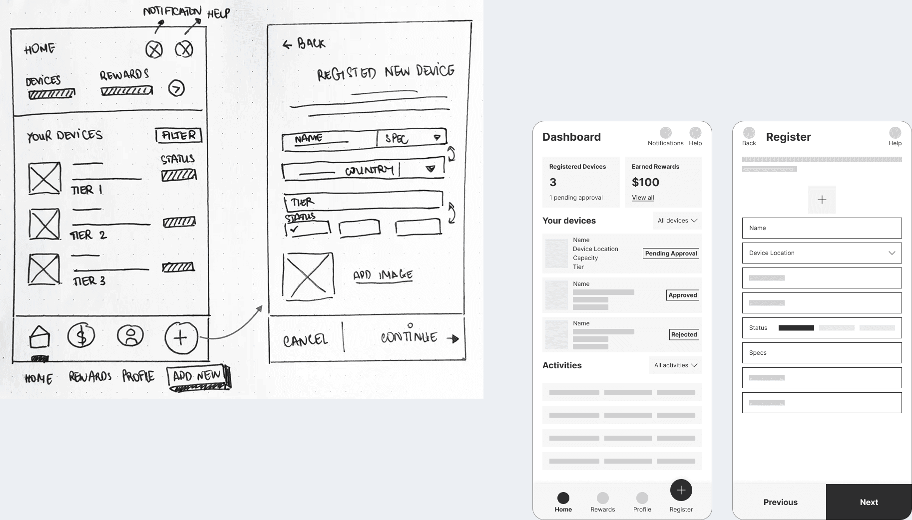 User Flow Redesign: I created a new flow for the registration process, starting with a clear call-to-action and guiding the user through inputting device details and location.